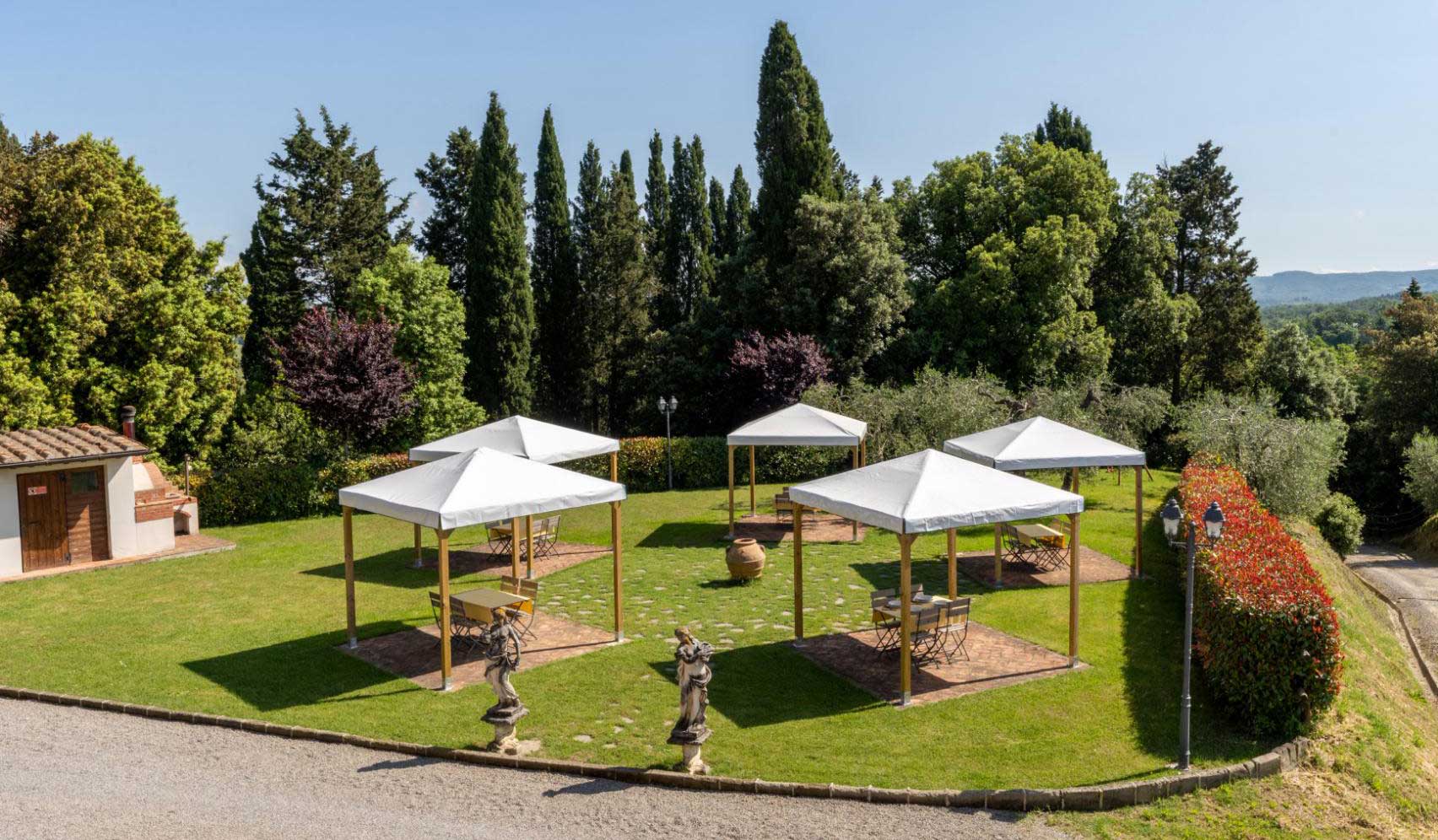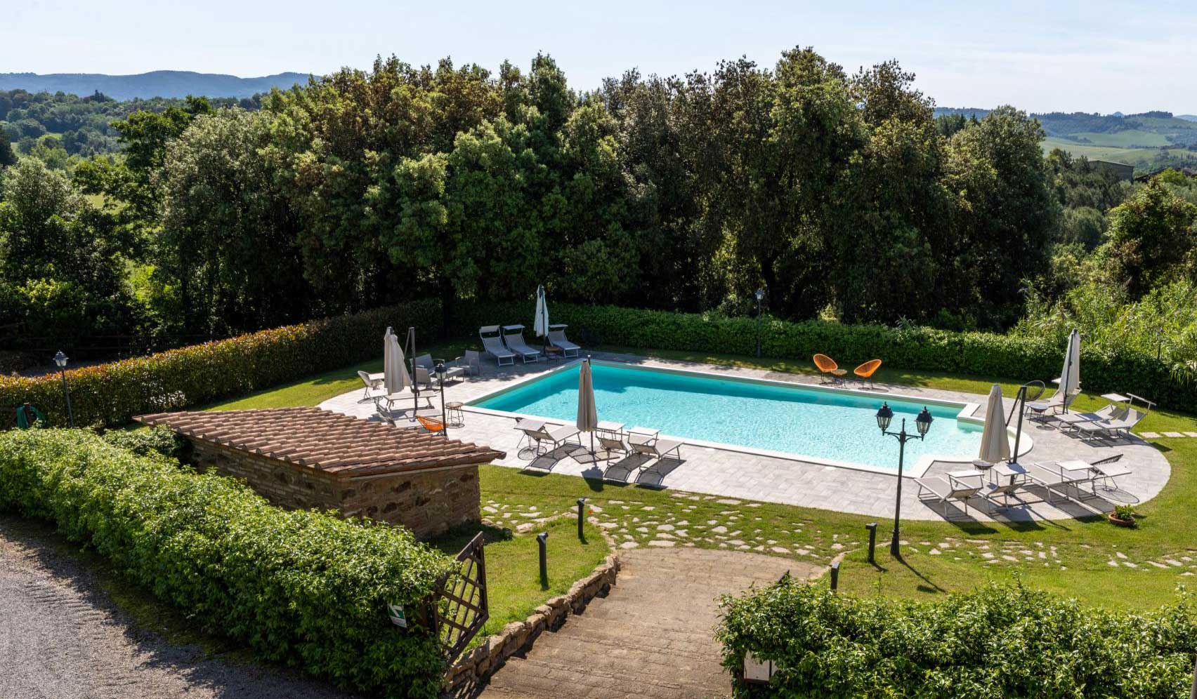 Le finestre si affacciano sul giardino, incorniciando il verde e le linee morbide del paesaggio. Alzando lo sguardo si scorge il profilo di Castelfalfi, e proseguendo di San Gimignano.