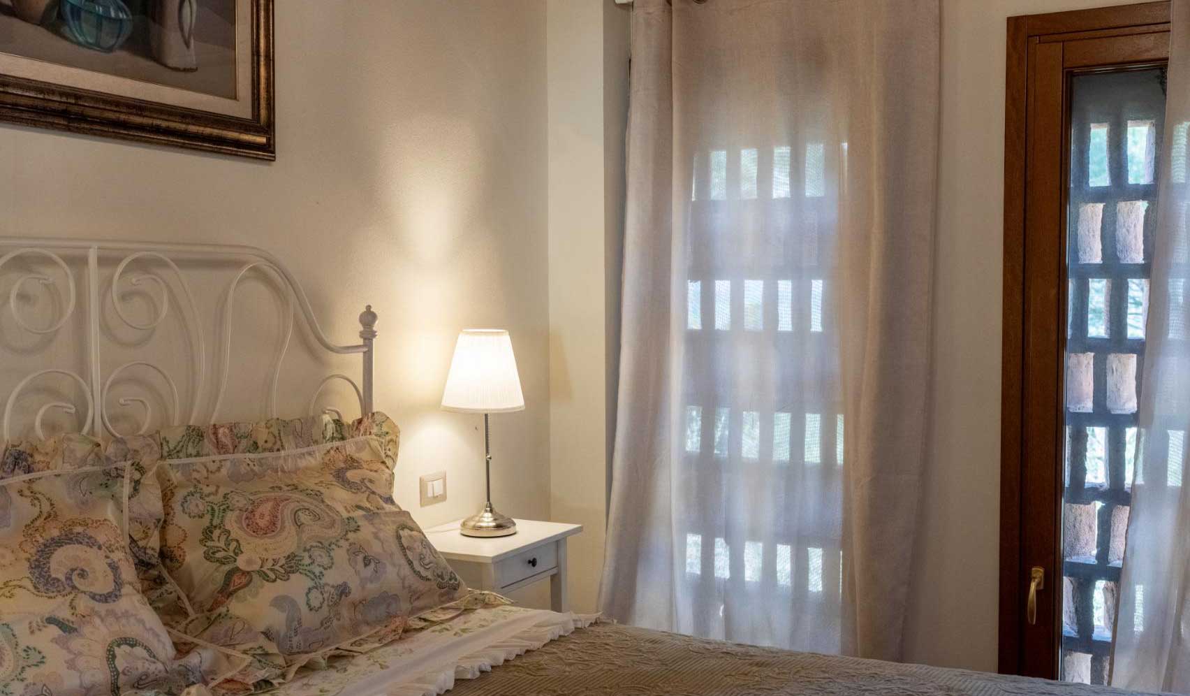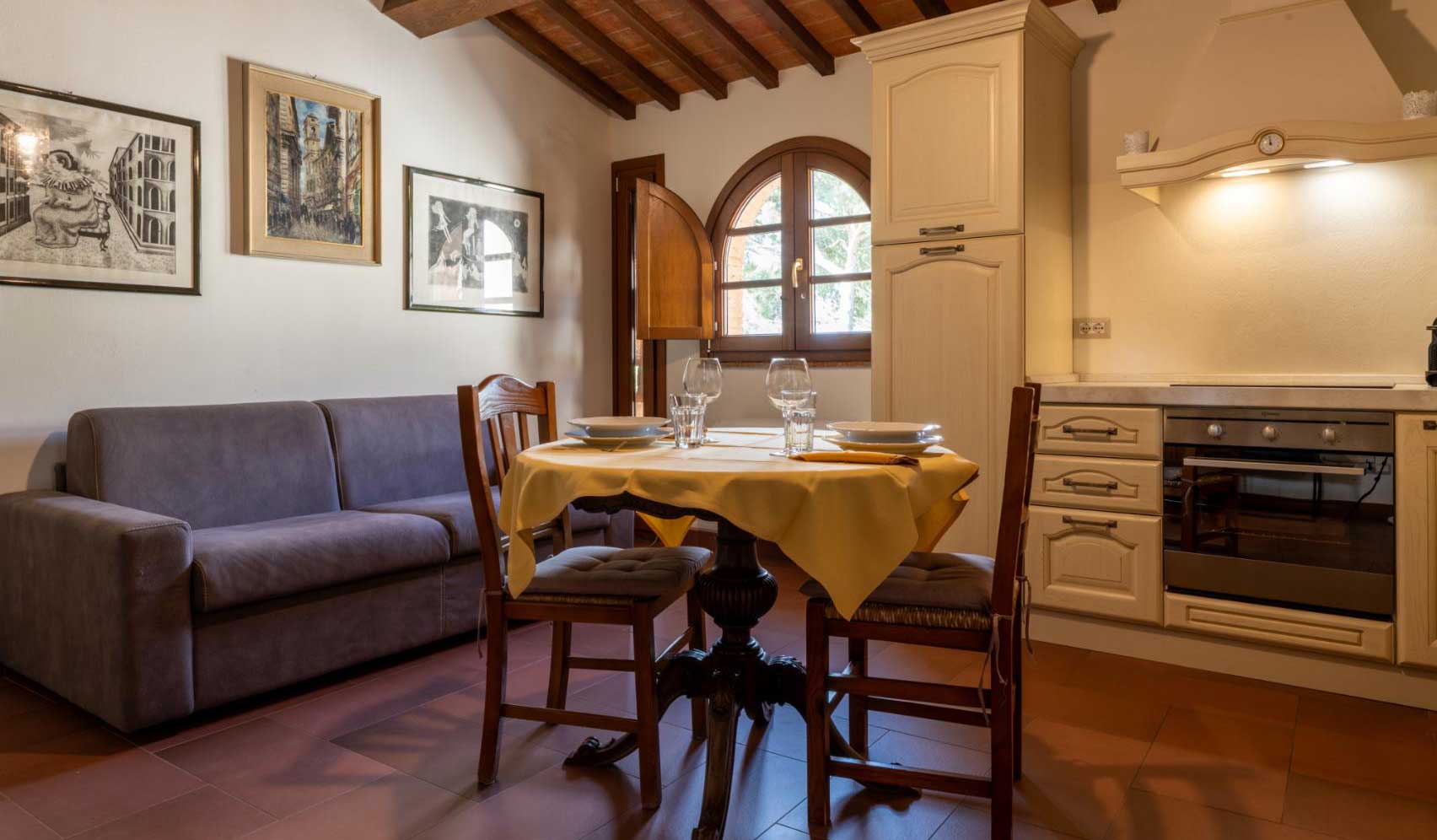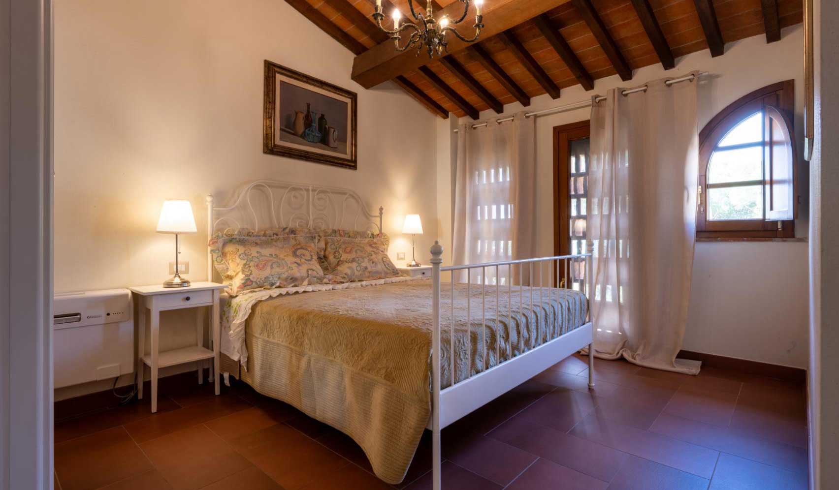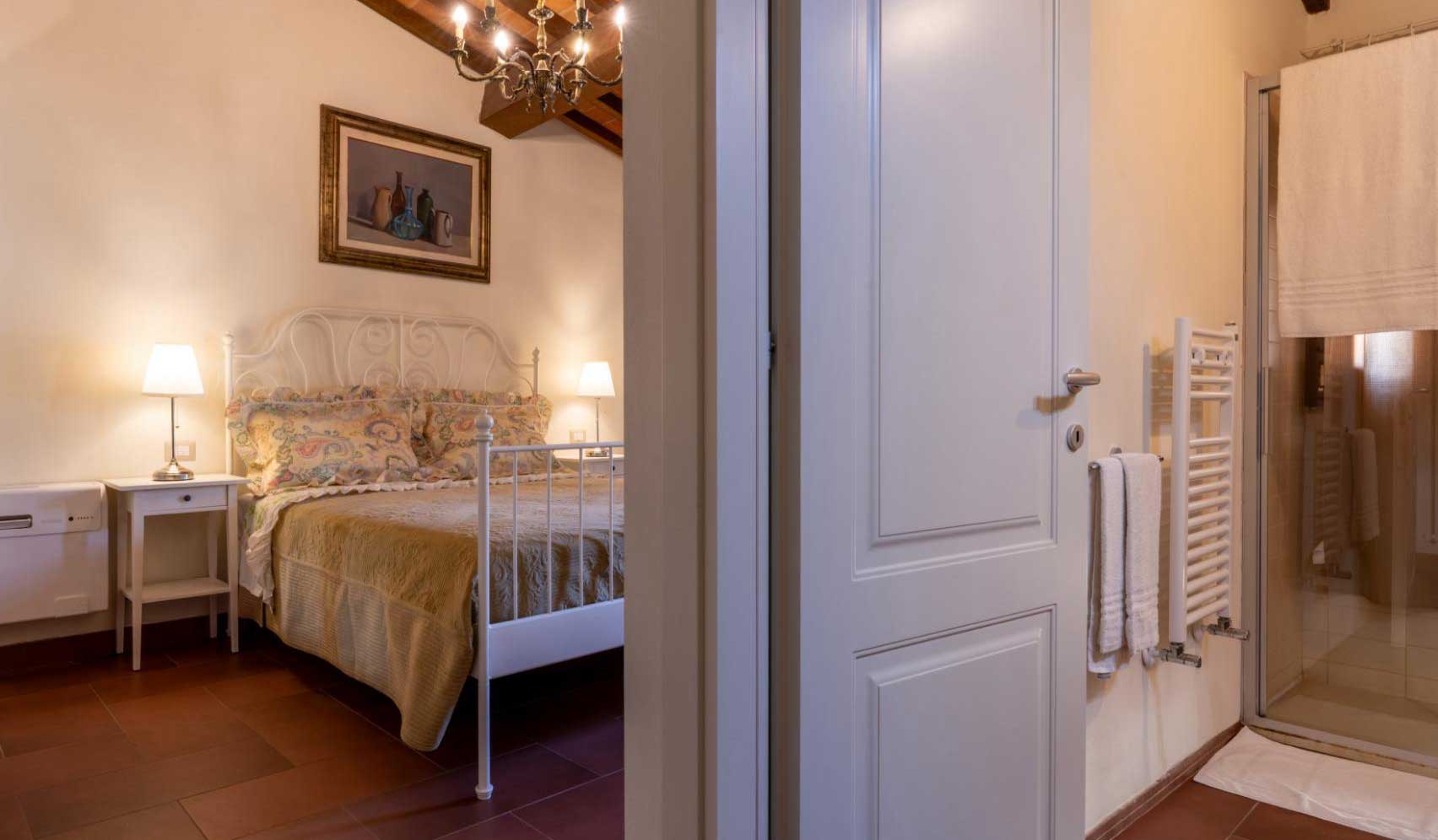 Enotria si trova al primo piano della Magione ed è pensato per chi cerca equilibrio tra luce, silenzio e comfort. La zona giorno ampia e luminosa si apre sulla campagna circostante, con affacci che sembrano pensati per rallentare lo sguardo.